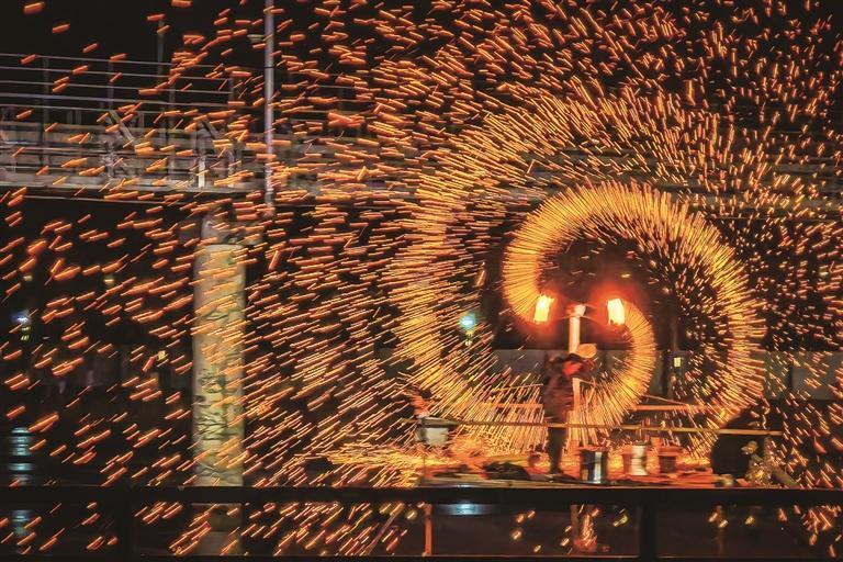 我們習(xí)慣用手機(jī)鏡頭捕捉這些“不期而遇”:孩童騎在父親肩頭,沉浸在年味兒的甜香,藏著中國(guó)式家庭最質(zhì)樸的親昵;釀酒工人在氤氳的酒香里忙碌,粗糙的雙手?jǐn)噭?dòng)著時(shí)光的醇釀,每一滴酒液都沉淀著勞動(dòng)者的踏實(shí)與堅(jiān)韌;街頭兩位身著同款服飾的女士,對(duì)著鏡頭侃侃而談,屏幕里流轉(zhuǎn)的不僅是話語(yǔ),更是普通人對(duì)生活的熱愛(ài);覽山公園里,皮影戲的光影在幕布上跳躍,圍觀的人群屏息凝神,老手藝與新觀眾的相遇,讓傳統(tǒng)有了鮮活的溫度;打鐵花的瞬間,熾熱的鐵水在空中綻放成金色的花火,照亮夜空的不僅是奇觀,更是匠人們代代相傳的勇氣與堅(jiān)守;母親帶著兩個(gè)孩子在陽(yáng)光下玩影子,指尖勾勒出的童趣,在地面上拼成最溫暖的畫(huà)卷。
