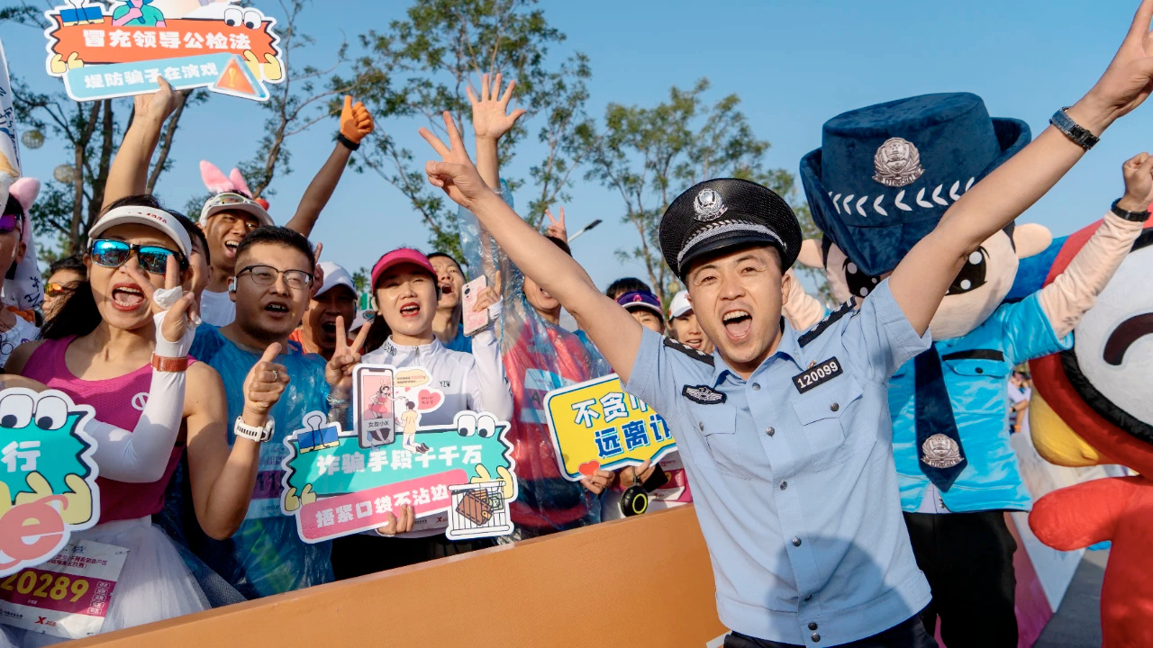 賽道沿途,20余處反詐提示牌化身“移動(dòng)安全站”,沿著賽道動(dòng)態(tài)展示反詐標(biāo)語(yǔ)。“防詐護(hù)跑、安心開跑”“跑贏馬拉松,更要跑贏詐騙”等幽默標(biāo)語(yǔ)與跑道計(jì)時(shí)芯片、卡通警察形象巧妙結(jié)合,為選手打造“跑一步、學(xué)一句”的沉浸式反詐體驗(yàn)。