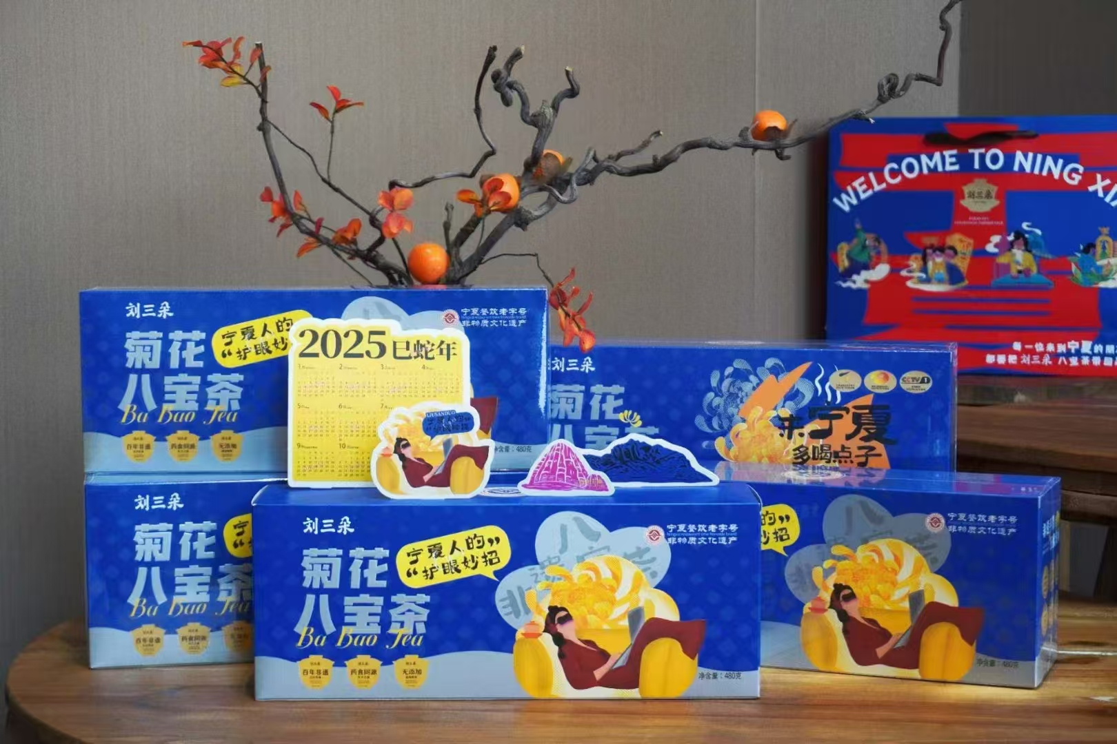 在劉三朵八寶茶體驗(yàn)館,濃郁的傳統(tǒng)文化氣息與現(xiàn)代創(chuàng)新設(shè)計(jì)相映成趣。劉三朵“浪寧夏”八寶茶心意禮盒以精美插畫結(jié)合生肖元素,標(biāo)注“寧夏人的早茶搭子”“寧夏餐飲老字號(hào)”“非物質(zhì)文化遺產(chǎn)”等宣傳語(yǔ),既體現(xiàn)地域特色,也強(qiáng)調(diào)文化傳承,兼具裝飾性與實(shí)用性,成為中秋贈(zèng)禮的理想選擇。