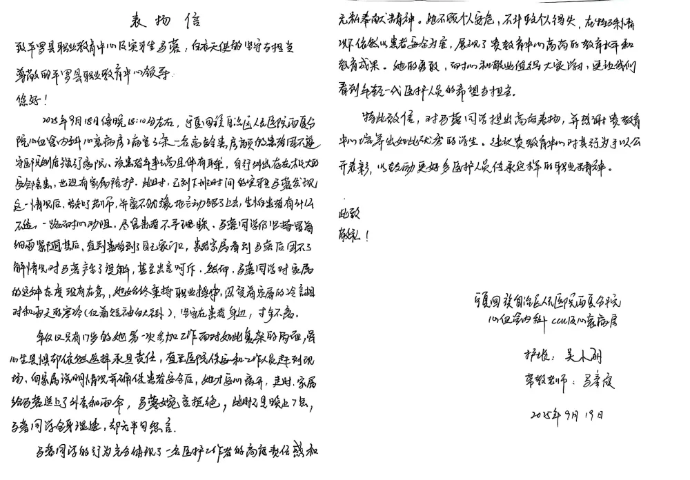 寧夏回族自治區(qū)人民醫(yī)院西夏分院心血管內(nèi)科心衰病房發(fā)給學(xué)校的表揚信。