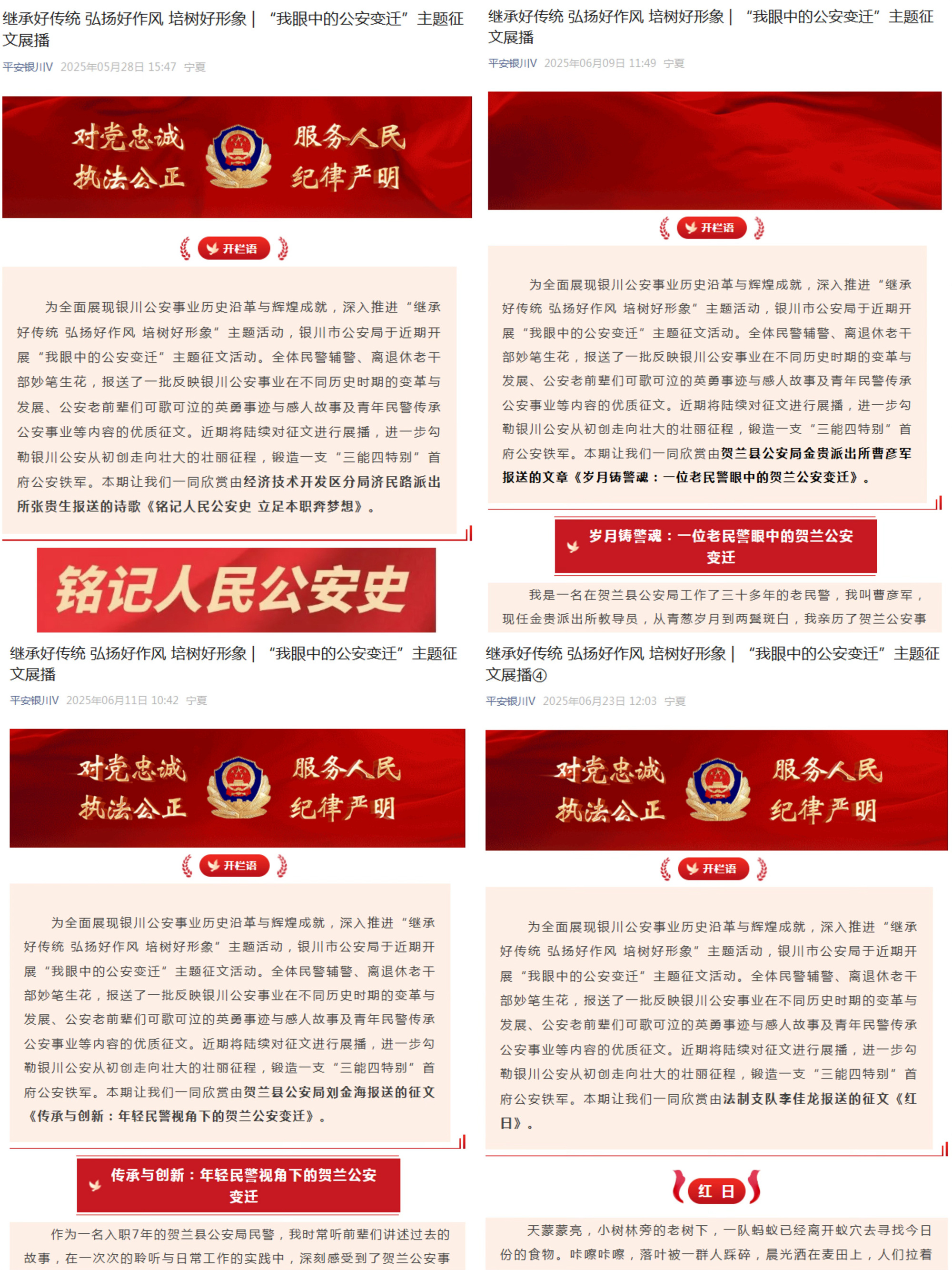 同時,“我眼中的公安變遷”主題征文活動也收獲頗豐。征文深入挖掘銀川公安史上的重大事件和關鍵歷史階段。有的作者講述公安前輩們在新中國成立初期,面對復雜治安形勢,不畏艱險、深入敵巢,成功破獲多起重大案件的英勇事跡;有的回憶改革開放時期,銀川公安積極探索創(chuàng)新,建立現(xiàn)代化警務機制,為經(jīng)濟社會發(fā)展保駕護航的奮斗歷程;還有的描繪了新時代銀川公安借助科技賦能,推動智慧警務建設,提升社會治理效能的嶄新風貌。