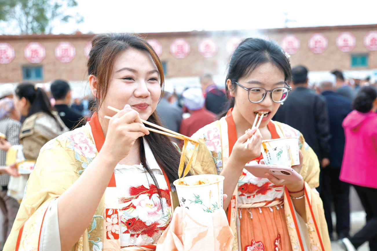 農(nóng)特產(chǎn)品是鄉(xiāng)村發(fā)展的金名片?;顒?dòng)當(dāng)日,高莊村老巷子化身“美食與農(nóng)產(chǎn)品一條街”,600米的農(nóng)特產(chǎn)品展示區(qū),平羅“十三香”悉數(shù)亮相,各鄉(xiāng)鎮(zhèn)帶來的豐收果、豐收糧、豐收菜等,匯聚成一場(chǎng)“豐收宴”。其中,最吸引人的當(dāng)數(shù)一口超級(jí)大火鍋?;疱伬镅b滿了羊肉、青菜、豆腐等食材,湯汁翻滾、香氣四溢,四面八方的游客和當(dāng)?shù)卮迕裼行蚺抨?duì),共赴一場(chǎng)“團(tuán)結(jié)火鍋宴”?!暗谝淮卧谪S收節(jié)上吃這么豐盛的火鍋,熱鬧又暖心,感覺特別有意義!”來自銀川的游客王倩茹說,她特意帶著家人來參加豐收節(jié),既體驗(yàn)了鄉(xiāng)村風(fēng)情,又品嘗了特色美食,收獲滿滿。