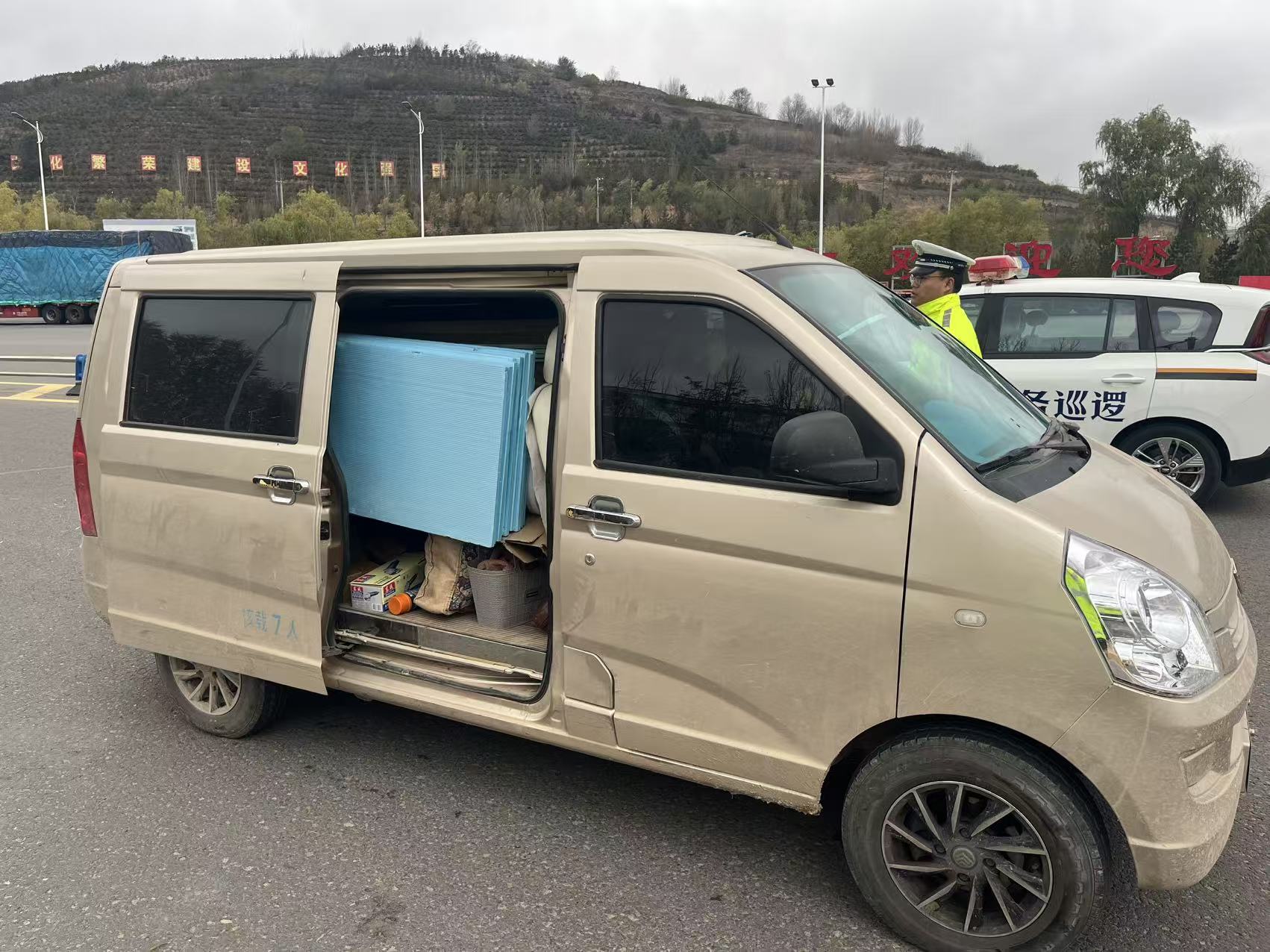 2025年11月4日,固原高速交警二大隊(duì)在西吉東收費(fèi)站執(zhí)勤時(shí),發(fā)現(xiàn)一輛面包車疑似客貨混裝,隨即示意駕駛員停車接受檢查。發(fā)現(xiàn)該車輛后排座位直到車尾部全部被貨物塞滿,存在極大的安全隱患。