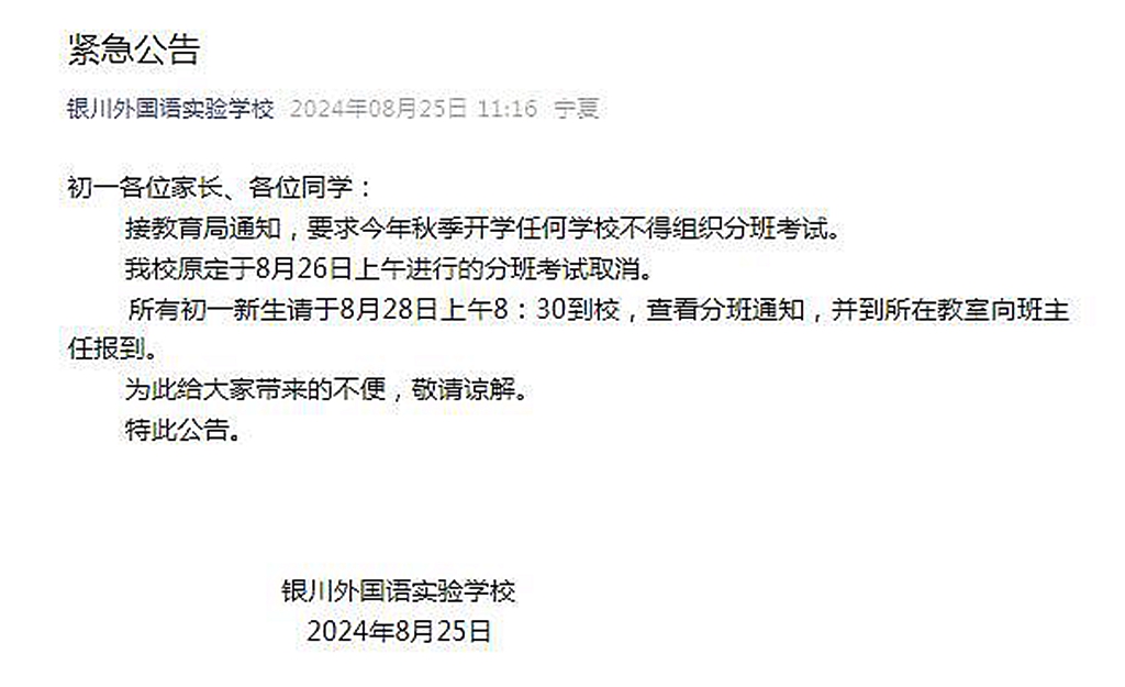 銀川外國語實驗學(xué)校初一新生分班考試被緊急叫停