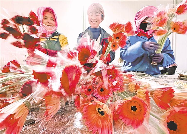 位于銀川市興慶區(qū)掌政鎮(zhèn)的閩寧協(xié)作花卉種植示范園里,寧夏西月花卉科技有限公司的工人在包裝剛剛采摘的非洲菊。目前,該示范園年產(chǎn)郁金香、非洲菊、大飛燕等品種鮮花2000余萬(wàn)枝,銷往全國(guó)各地。 寧夏日?qǐng)?bào)記者 馬楠 王洋 攝