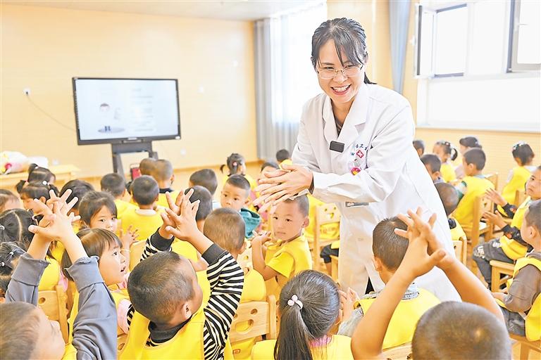 2023年9月14日,福建援寧醫(yī)療隊(duì)隊(duì)員張秀喜在離開(kāi)寧夏前,來(lái)到永寧縣木蘭幼兒園,為孩子們講授秋季傳染病預(yù)防知識(shí)?!幭娜?qǐng)?bào)記者 左鳴遠(yuǎn) 攝