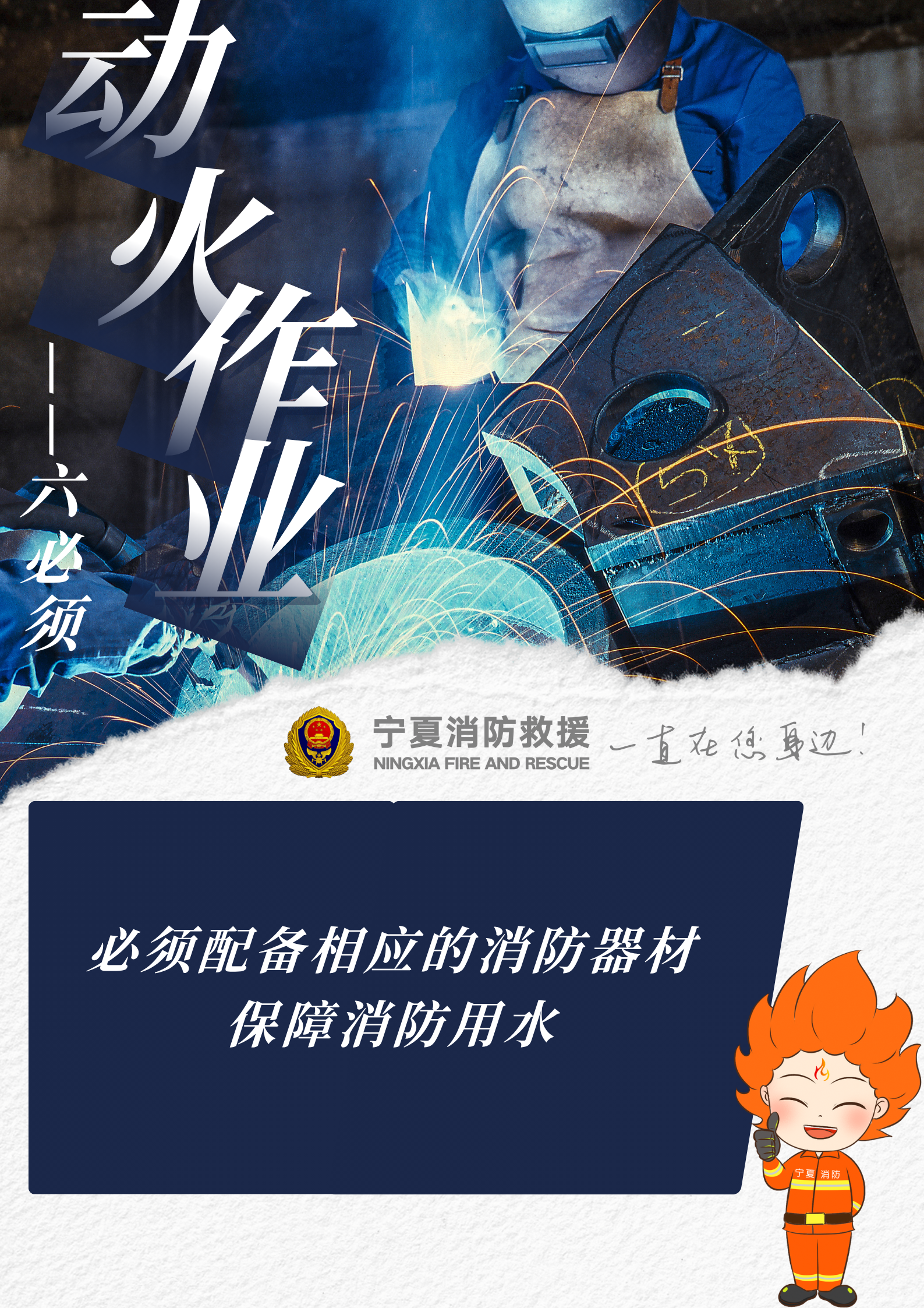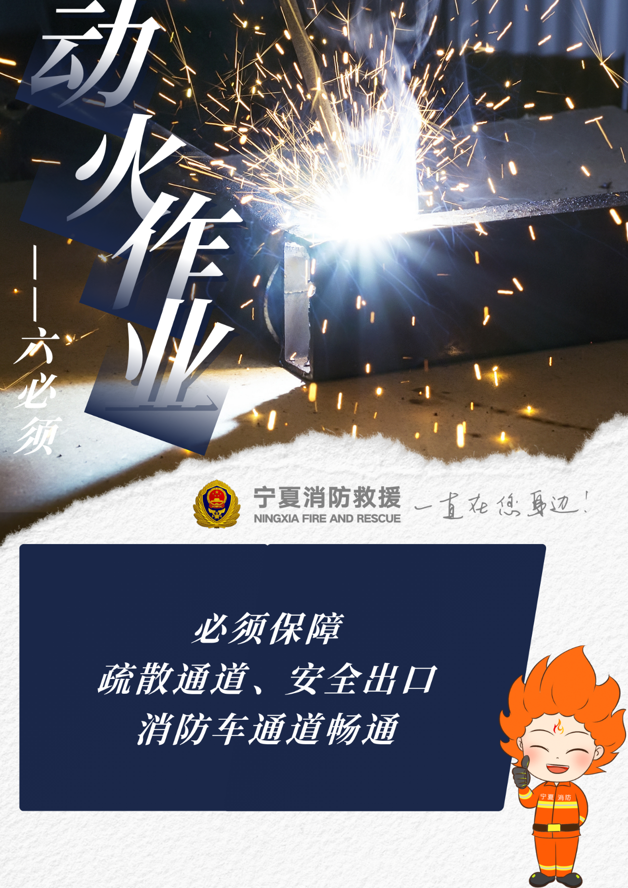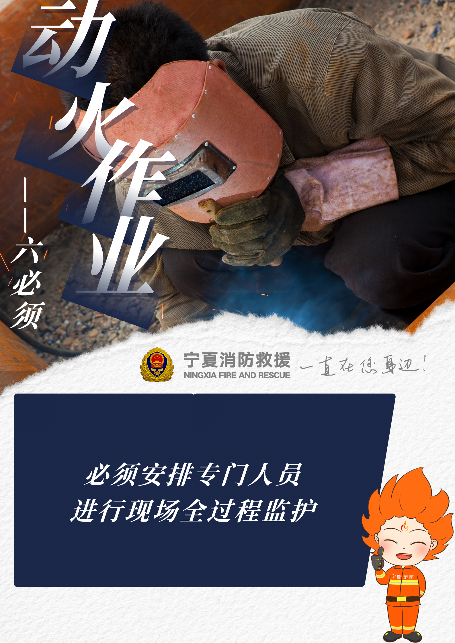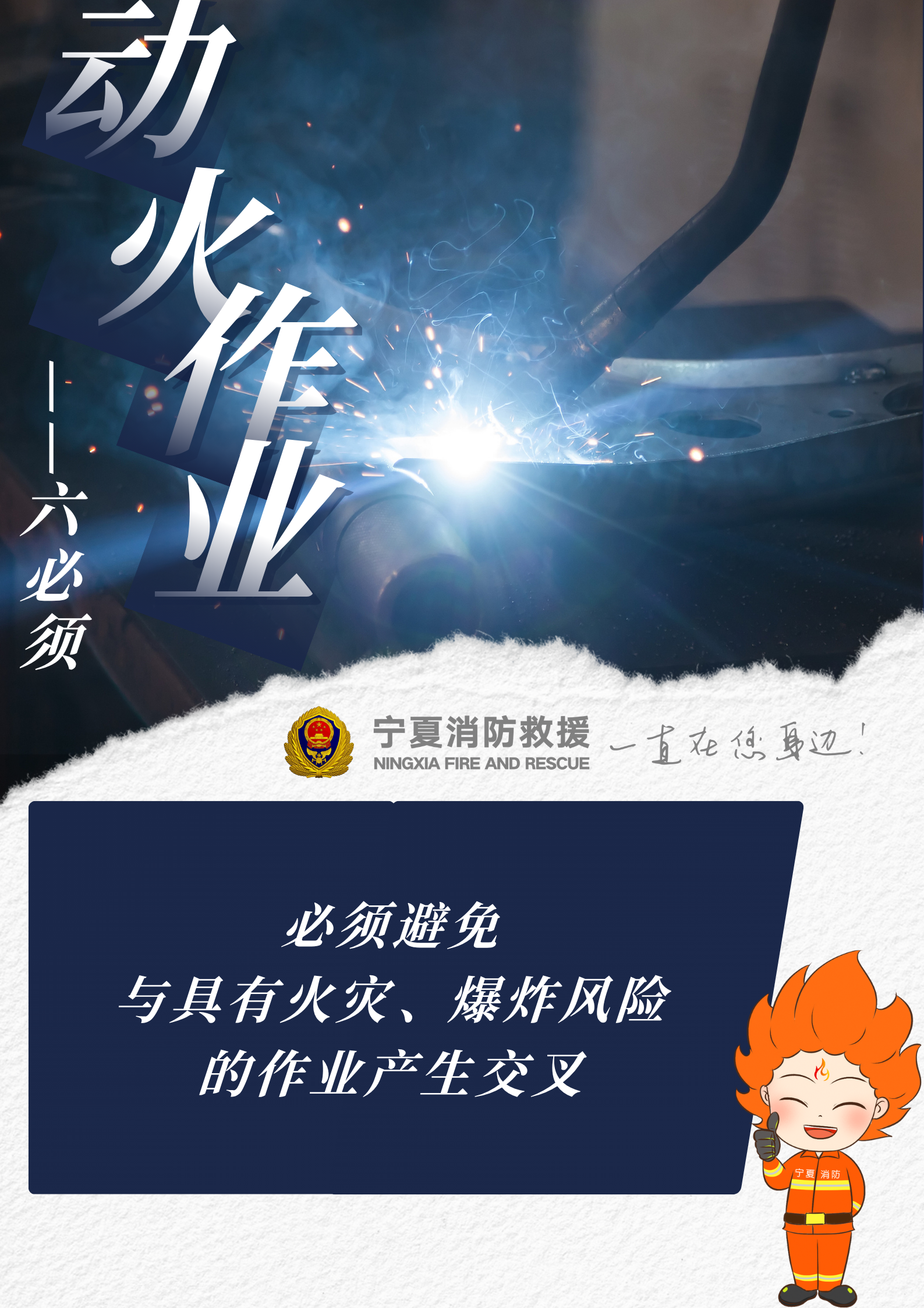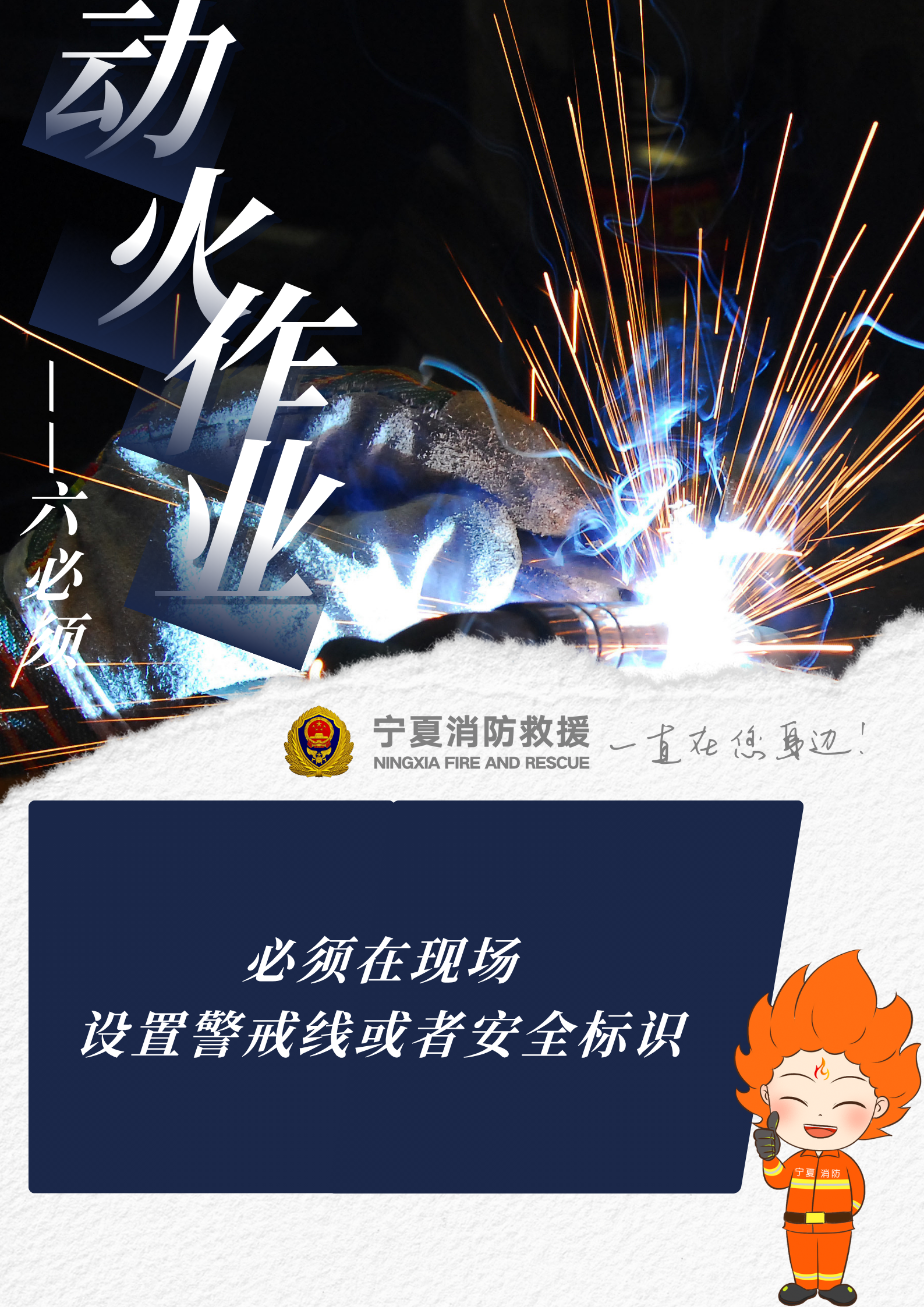實驗證明:焊割作業(yè)過程中產(chǎn)生的火星、熔渣極易引燃周邊可燃物,一定要留意被焊割物,清空現(xiàn)場可燃物。動火作業(yè)的相關(guān)人員一定謹記動火作業(yè)相關(guān)安全措施,嚴格遵守操作規(guī)程,牢記以下動火作業(yè)“六必須”——